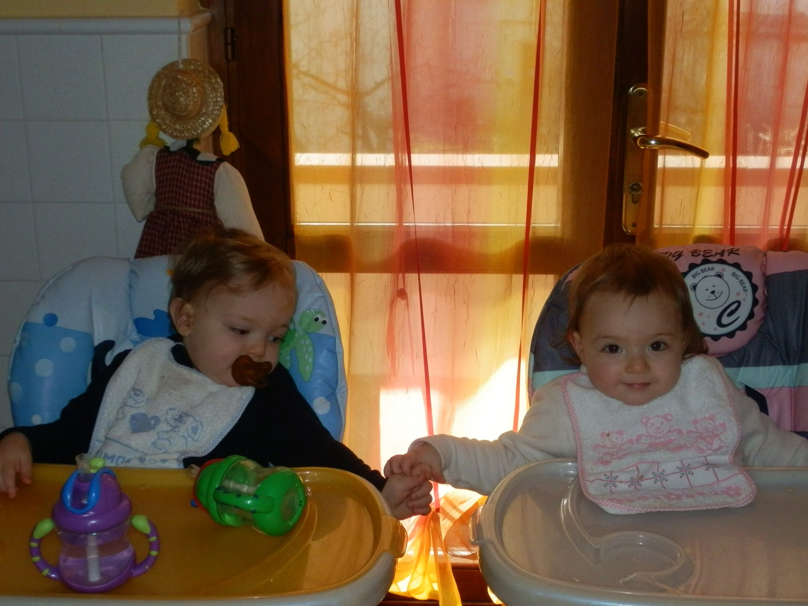 Ormai hanno preso dimestichezza con il cucchiaio, il piattino e il bicchiere. Fanno – ovviamente – ancora fatica a mangiare cose particolarmente liquide, come minestre e brodaglie, anche se migliorano di volta in volta.